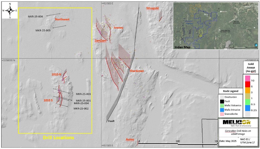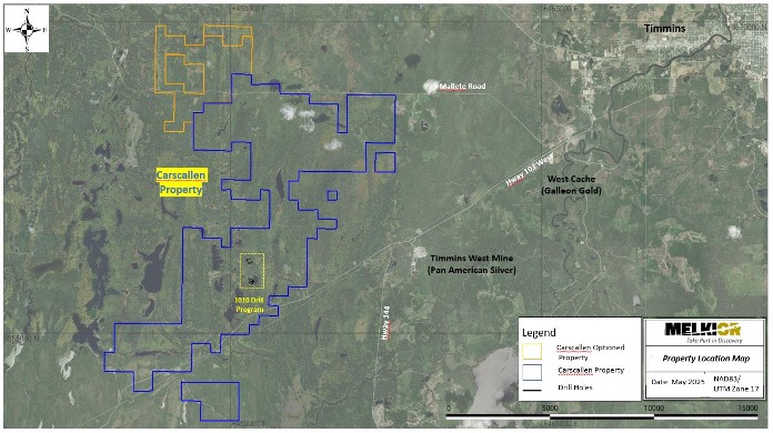 Timmins, Ontario – Melkior Resources Inc. (“Melkior” or the “Company”) (TSXV:MKR) (OTC:MKRIF) is pleased to announce an upcoming follow-up exploration drill program at the Carscallen Gold Property in Timmins. The 6-hole drill program has been designed with a total of approximately 1,725 meters to focus on expanding the strike and down-dip continuities of the NNW-SSE trend, 1010 Zone structural corridor, which includes testing new gold opportunities at the Northwest Prospect, all located about 25 kilometres west of the City of Timmins.