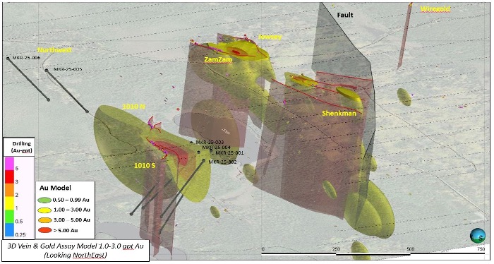 - Follow-up drilling on the discovery of a significant bonanza gold intercept extending the 1010 zone at depth, from hole MKR-24-002, which intersected 77.4 g/t gold over 6.90 meters, including 445 g/t gold over 1.20 meters at the 1010 South (Table 1, Figures 2-5).
